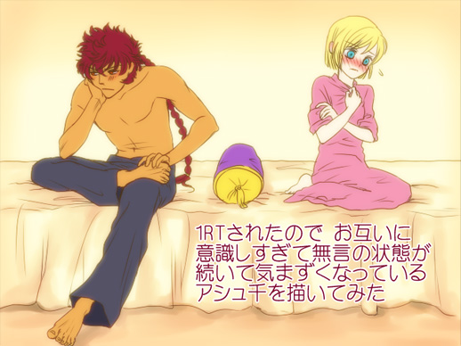 それでツイッターの診断で描くことになった続き(?)絵を、ちょっとアレなんで続きを読むに投下しました。ちなみにお題は『お互いに意識しすぎて無言の状態が続いて気まずくなっているアシュ千』です~